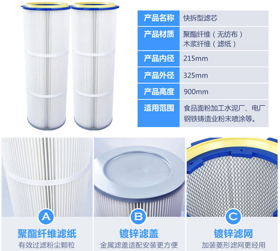 新鄉市利菲爾特濾器股份有限公司專業生產抗靜電濾材除塵濾筒,空氣除塵濾筒由長度挺括的濾料折疊成褶, 尾粘合而成的星形過濾筒。濾筒無籠骨,安裝簡便。空氣除塵濾筒的品種較多,有細而長與粗而短之分。細長濾筒(如Φ≤160,L=1~2m),其褶(如45褶)間空隙大、夾角大,褶少而淺,過濾面積比同徑同長的濾袋大2~5倍,清灰易而效果好;適用于濃度≥15g/m粉塵的過濾除塵,過濾風速0.6~1.2m/min。粗短濾筒(如Φ350,L=0.66m)直徑大、長度短、褶多(120~350褶)而深、褶間空隙小,過濾面積大,較之同徑同長濾袋面積大14~35倍,適于場地面積小、空間小的地方布置;但因褶角小,粉塵易積聚,難于清灰,適于濃度≤5g/m粉塵的過濾除塵,過濾風速不宜>0.6m/min。空氣除塵濾筒是由 長度挺括的濾料折疊成褶, 尾粘合而成的星形過濾筒。濾筒無籠骨,安裝簡便。濾筒的品種較多,有細而長與粗而短之分;細長濾筒(如Φ≤160,L=1~2m),其褶(如45褶)間空隙大、夾角大,褶少而淺,過濾面積比同徑同長的濾袋大2~5倍,清灰易而效果好;適用于濃度≥15g/m粉塵的過濾除塵,過濾風速0.6~1.2m/min。粗短濾筒(如Φ350,L=0.66m)直徑大、長度短、褶多(120~350褶)而深、褶間空隙小,過濾面積大,較之同徑同長濾袋面積大14~35倍,適于場地面積小、空間小的地方布置;但因褶角小,粉塵易積聚,難于清灰,適于濃度≤5g/m粉塵的過濾除塵,過濾風速不宜>0.6m/min。