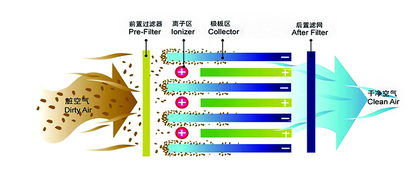 極板式油煙凈化器是利用高壓發(fā)生器續(xù)穩(wěn)定輸高壓,高壓載體極板式電場(chǎng)所應(yīng)用的靜電除煙技術(shù)是利用陰極板在高壓電場(chǎng)中放射出來電子,以及由電子碰撞空氣分子而產(chǎn)生負(fù)離子來捕捉油煙、油霧粒子,使其粒子帶,在通過高壓電場(chǎng)產(chǎn)生庫(kù)倫力,使帶電粒子被陽(yáng)極吸附,以達(dá)清除目的,由于電子直徑比較小,其徑比油煙及油霧粒子的徑小很多數(shù)量級(jí),而且電場(chǎng)中電子密度很高,可以說無處不處在電場(chǎng)中的煙塵粒子很容易被荷電捕捉。煙塵粒子在電場(chǎng)中的荷電是循環(huán)包括電場(chǎng)荷電和擴(kuò)散荷電等機(jī)理的必然現(xiàn)象,而不是簡(jiǎn)單的偶爾碰撞引起的, 帶電粒子在電場(chǎng)中會(huì)受到庫(kù)倫力的作用,使其結(jié)果是煙塵粒子被吸附到陽(yáng)極上,因此靜電除油煙效率很高,而且特別適用于與捕捉徑粒較小和重量較輕的煙塵粒子,極板式油煙凈化設(shè)備的電能主要用來放射電子和推動(dòng)煙塵粒子,其設(shè)計(jì)決定電場(chǎng)與空氣不產(chǎn)生機(jī)械力作用,因而靜電場(chǎng)的能耗較小,阻力也較小,無需使用較大壓力風(fēng)機(jī)牽引,總能耗相比其他除油方式要小。